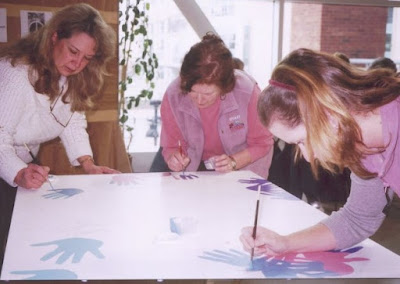 The next morning, I arrived at the studio space and there were people lined up waiting for me to begin!!! I was shocked and amazed! Quickly, I unlocked the doors and got the paints ready and people got busy adding their 'healing hands' to the canvas!!!